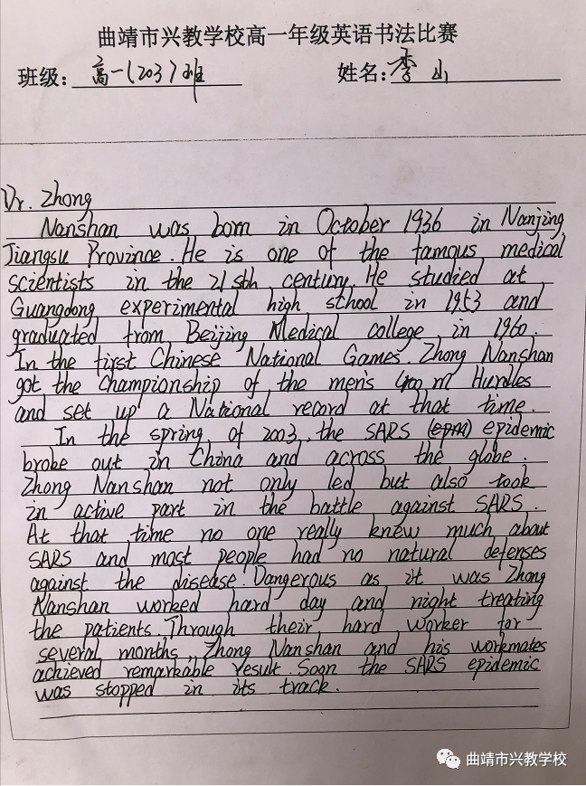 为让高一年级形成规范书写的氛围,为高考书写整洁打好坚实的基础,同时为调动学生学习英语的积极性,激发学生学习英语的兴趣,提高教学质量,我校高一年级举行英语书法比赛。