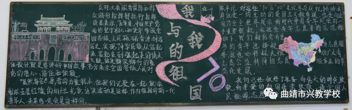 为庆祝新中国成立70周年,大力推进我校校园文化建设,增强同学们的爱国情怀,曲靖市兴教学校举行“爱我中华,喜迎国庆”黑板报评选活动。本次活动由政教处和团委组织,奖项共设一等奖2名,二等奖3名,三等奖5名。
