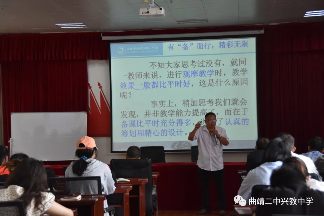 7月18日上午,我校邀请麒麟区第七中学副校长胡勇老师作了«教师的备课和反思——探究“成为更具胜任力教师”的路径»专题讲座。胡老师从“备课,上好课的前提;备课,究竟备些什么;备课,如何做更有效;反思,助推我们成长;职业生涯的幸福感从哪里来”五个方面,向我们系统地诠释了怎样成为一名更具胜任力的教师。强调备好课不一定就能上好课,但要上好课就必须备好课。教育只有研究才能不断有新的发现,备课也需要不断的变化,常备常新,不拘泥于传统,打破固有模式,才能够让我们朝着研究型教师的方向发展,获得职业生涯的幸福感。胡老师还提醒我们注重反思:一个教师写一辈子的教案不一定成为名师,如果一个教师写三年反思,有可能成为名师。一个人遇到好老师是人生的幸运,一个学校拥有好老师是学校的光荣,一个民族源源不断涌现出一批又一批好老师则是民族的希望。胡老师希望我们年轻老师能用无限的激情和热爱投入到教育教学中去,争做好老师!